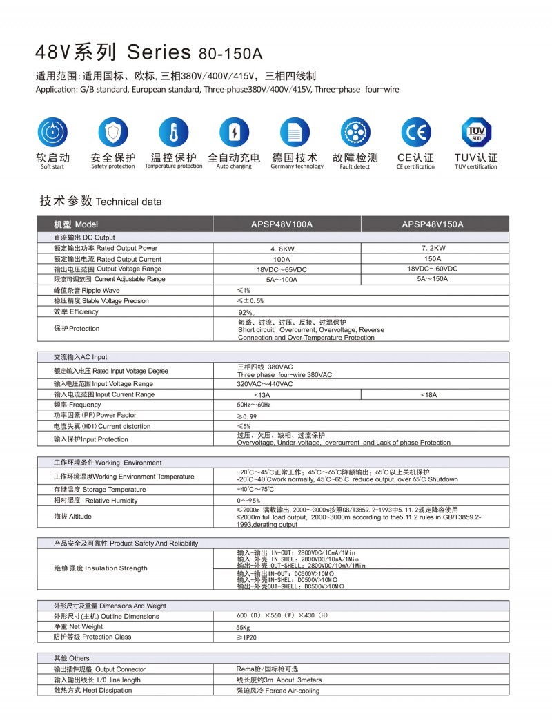 觸摸屏智能操作設計:告別傳統按鍵方式,給您帶來更現代更具科技智能的操作體驗 自動充電:插槍自動充電,簡化充電流程,便于操作 兼容性高:80V200A兼容48V200A充電 多重保護: 輸出短路,過流過壓保護,反接保護,電流導管保護等多重保護 預約充電功能:避開高峰用電時段,有效節省成本 雙語切換:中英文雙語隨需切換,跨越語言障礙,與世界接軌 人性化設計:充電機背板內部附部件明細及產品接線圖,方便客戶可更清楚的了解產品,便于維修,提高售后時效 獨特設計: 內置電磁鎖驅動模塊,防止臨時斷電鎖槍 使用壽命更長:功率模塊預留20%空間,提高模塊的使用壽命 出色內部結構: 內部結構左右出風,內部電路不容易積粉塵,提高充電機壽命