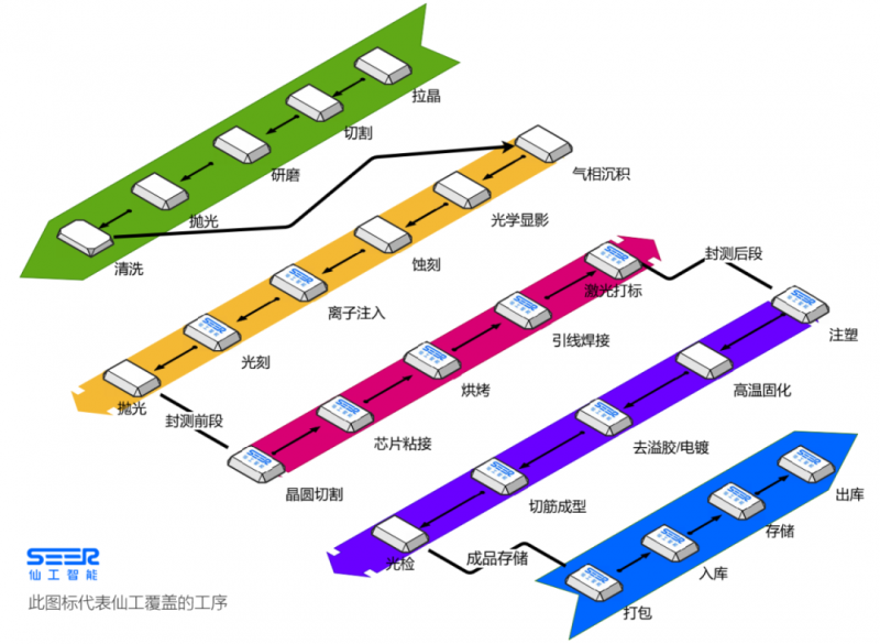 仙工智能經(jīng)過(guò)多年的耕耘,已經(jīng)覆蓋了半導(dǎo)體行業(yè)制程工序的絕大部分工序,從 IC 制造到 IC 封測(cè)的工序間物料到成品和原材料的存儲(chǔ)和出入庫(kù)等傳統(tǒng)物流工序都有覆蓋。今天分享的就是其中的晶圓處理制程。