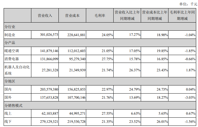 根據(jù)美的集團2021年年度報告顯示,2021年全年,美的集團實現(xiàn)營業(yè)總收入約3412億元,同比增長20.06%;實現(xiàn)扣非凈利潤約259億元,同比增長5.34%。其中,機器人與自動化業(yè)務(wù)在2021年實現(xiàn)營收約273億元,同比增長26.37%。
