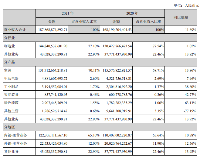 根據(jù)格力電器2021年財報顯示,公司2021年營業(yè)收入1878.69億元,同比增長11.69%;實現(xiàn)歸母凈利潤230.64億元,同比增長4.01%。其中智能裝備8.58億元,同比增長42.77%。