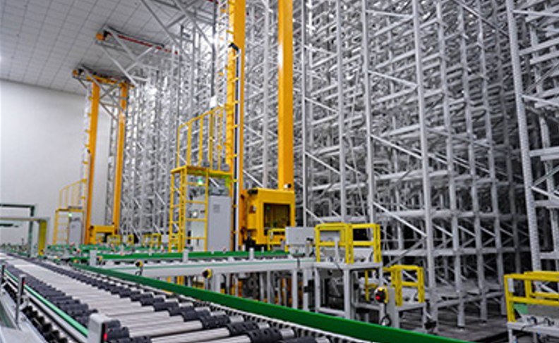 成品庫(kù)3臺(tái)轉(zhuǎn)軌堆垛機(jī)完成鋰電池成品存取,共31,296個(gè)托盤(pán)貨位