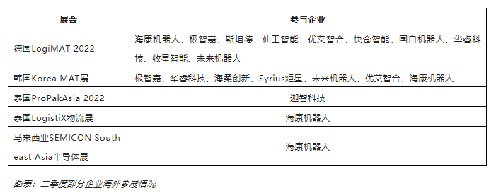 二季度,海外比較受關(guān)注的展會如德國LogiMAT 2022及韓國Korea MAT展都吸引了不少國內(nèi)企業(yè)的參與,如海康機器人、極智嘉、斯坦德、仙工智能、優(yōu)艾智合、快倉智能、國自機器人、華睿科技、牧星智能等,都攜旗下代表性產(chǎn)品及方案一一亮相。