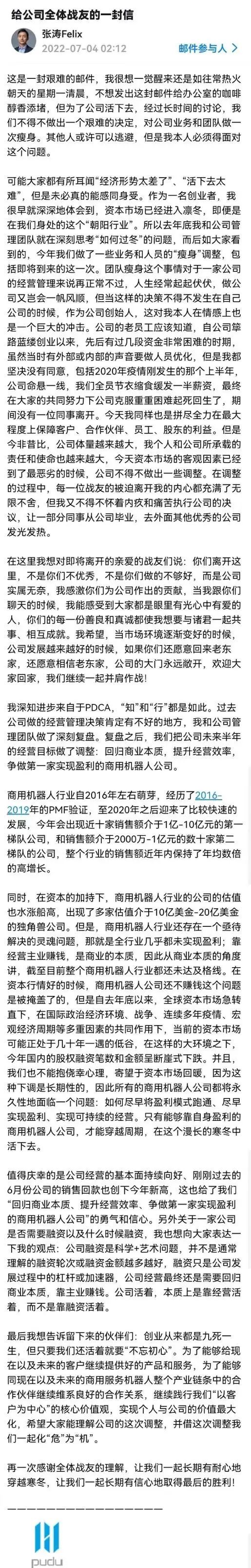 7月4日凌晨,普渡科技CEO張濤發(fā)全員信,稱為了公司活下去,經(jīng)過長時間的討論,不得不做出一個艱難的決定,對公司業(yè)務(wù)和團隊做一次瘦身。