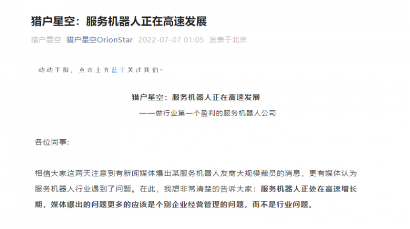 7月7日凌晨,獵戶星空在其官方公眾號上發(fā)文稱:服務(wù)機器人正處在高速增長期,媒體曝出的問題更多的應(yīng)該是個別企業(yè)經(jīng)營管理的問題,而不是行業(yè)問題。