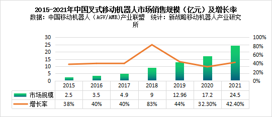 圖表:2015-2021年中國叉式移動機器人市場銷售規(guī)模(億元)及增長率