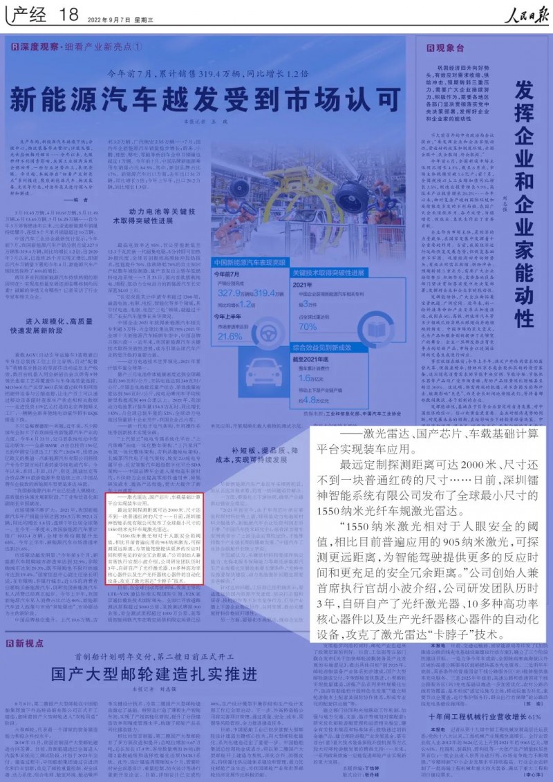 2022年9月7日,人民日?qǐng)?bào)刊登了一篇名為《新能源汽車越發(fā)受到市場(chǎng)認(rèn)可》的文章,其中介紹了鐳神智能創(chuàng)始人胡小波帶領(lǐng)團(tuán)隊(duì)攻克了我國(guó)被“卡脖子”的激光雷達(dá)技術(shù)問(wèn)題。