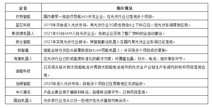 圖表:2021年光伏行業新增AGV/AMR類型分布整體來看,當前光伏行業的AGV/AMR應用還處于前期的階段,整體需求還未完全釋放,競爭相對較低,但伴隨著光伏行業近兩年投資擴產風潮的盛行,以及光伏企業對AGV/AMR產品認知度的不斷提高,光伏行業對AGV/AMR需求也在逐步放量。當前,光伏行業已經成為AGV/AMR企業重點布局領域之一。由于光伏行業對AGV/AMR的需求以自然導航類為主,當前,聚焦光伏行業的AGV/AMR企業也大部分以專注于自然導航(SLAM)類產品的企業為主,如藍芯科技、斯坦德、快倉智能、極智嘉、??禉C器人、迦智科技、佳順智能、中興通訊、玖物互通等。這些企業依托自然導航核心技術,結合光伏行業需求特點,也相繼形成了光伏行業解決方案。