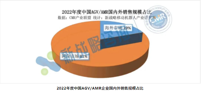 2022年,中國AGV/AMR企業在海外市場的銷售規模進一步提升,根據CMR產業聯盟數據,新戰略移動機器人產業研究所統計,2022年,中國AGV/AMR企業海外銷售規模為36億,同比增長44%。從2019年中國AGV/AMR海外銷售額首次突破10億人民幣到2022年的36億人民幣,不少企業的海外銷售占比得到較大提升。
