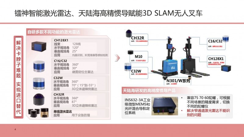 在論壇分享會上介紹了無人叉車配置的技術(shù)領(lǐng)先全球的鐳神智能激光雷達(dá)系列產(chǎn)品,解決了卡脖子難題,實(shí)現(xiàn)國產(chǎn)化自主可控,每臺無人叉車周身配置7-8顆激光雷達(dá),提供豐富穩(wěn)定的全方位立體感知信息,做到更安全、更穩(wěn)定、更可靠。