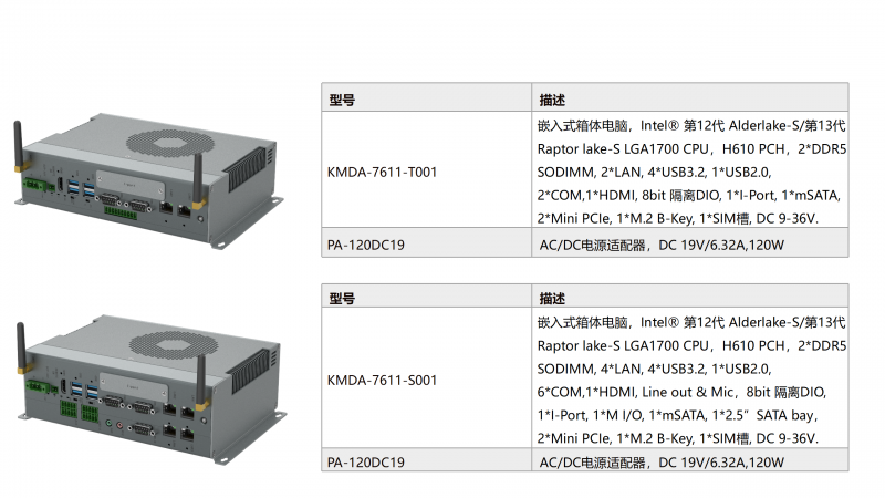 KMDA-7611是一款高性能箱體電腦,采用H610芯片組,搭載Intel®第12代Alder lake-S/第13代Raptor lake-S系列處理器,IO功能完整,體積大小適中,適用于無人叉車、機器視覺和工業控制等行業和領域。