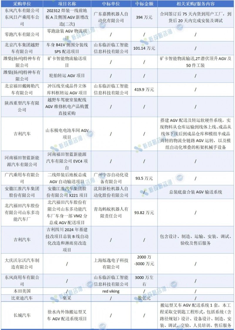 圖表:2024年一季度汽車行業(yè)部分AGV及智慧物流相關(guān)標訊