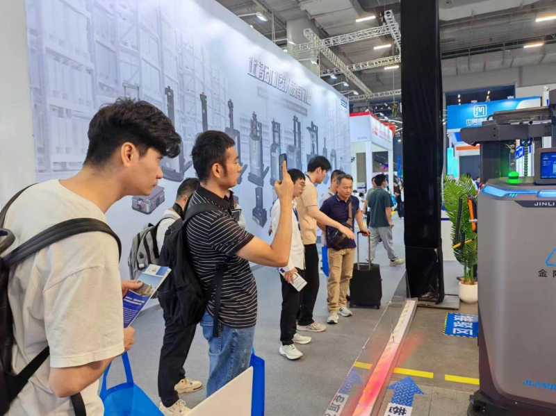 展會(huì)現(xiàn)場(chǎng),JLAMRF-014-S(O)叉式AMR在WMS智慧倉(cāng)庫(kù)管理系統(tǒng)、RCS智能機(jī)器人調(diào)度管理系統(tǒng)的調(diào)度下完成,從接駁區(qū)叉取托盤貨物,在1800mm的巷道內(nèi),轉(zhuǎn)運(yùn)至二層貨架,同時(shí)展示了自旋、橫移、自適應(yīng)叉取托盤時(shí)一步叉取到位等多項(xiàng)動(dòng)作,吸引眾多觀眾駐足觀看、咨詢。