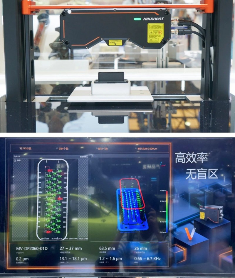 采用海康機器人自研的程控條紋光傳感器進行采圖,對車漆表面的顆粒,漆疤、劃痕、氣泡、針眼等缺陷進行在線全檢,最小可實現(xiàn)0.2mm的缺陷檢測,借助機械臂的柔性,檢測可達性區(qū)域幾乎覆蓋100%車身。