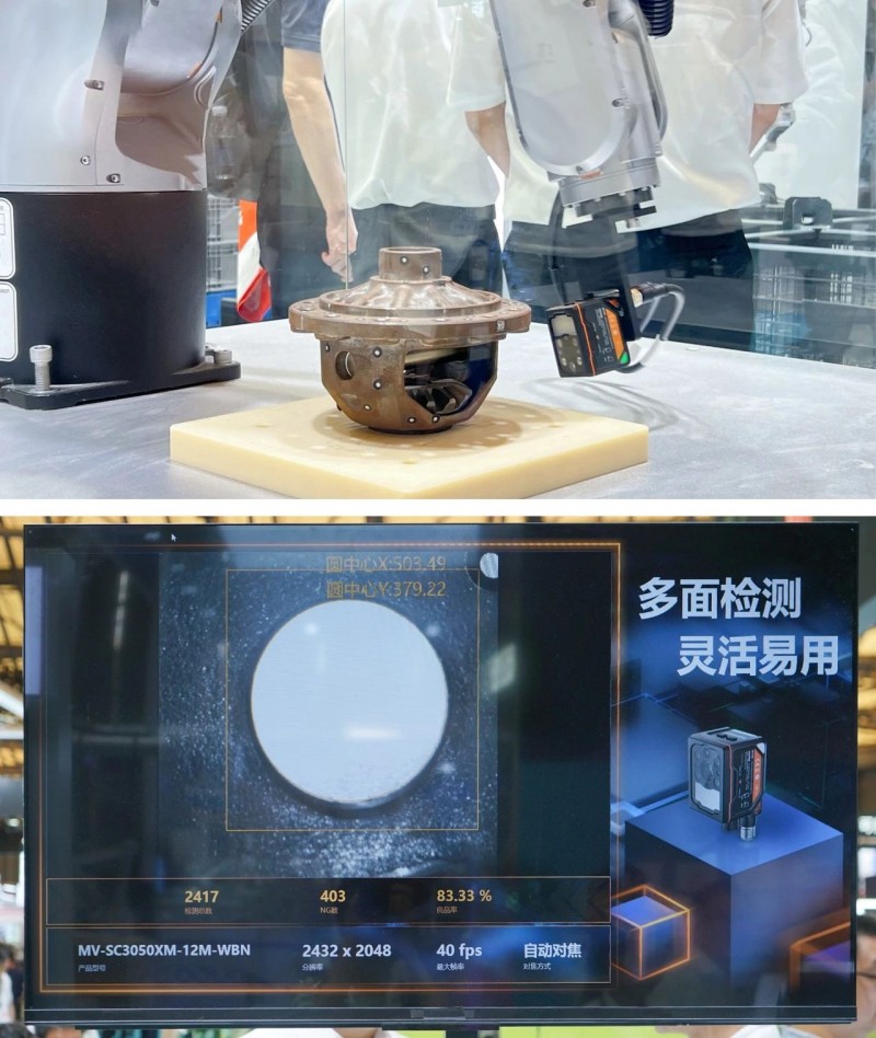 集成像、算法、存儲、通信于一身的SC3000X系列視覺傳感器,體積小巧,外觀緊湊,安裝更加靈活,內(nèi)部嵌入了讀碼、有無、正反、測量、識別和計數(shù)等防錯檢測算法,搭配機械臂對鑄造件的各個面進行碼信息、字符信息的檢測。