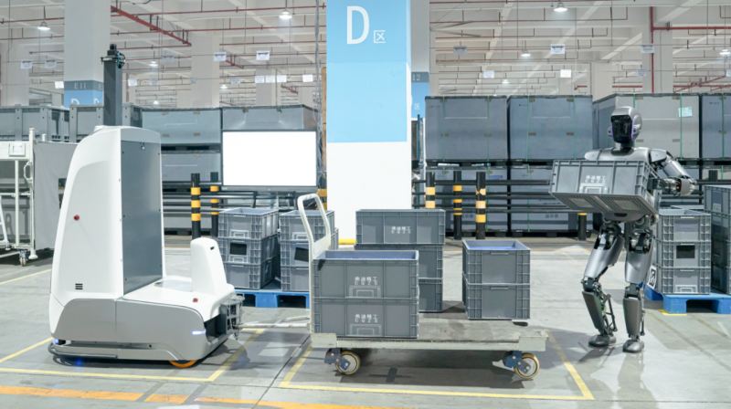 UQI優(yōu)奇的全棧式無人物流解決方案中,人形機(jī)器人可以與無人物流車、無人叉車等工業(yè)移動(dòng)機(jī)器人和智能制造管理系統(tǒng)協(xié)同完成分揀、搬運(yùn)和配送任務(wù)。人形機(jī)器人Walker S1接收UPilot移動(dòng)機(jī)器人操作系統(tǒng)的物料轉(zhuǎn)運(yùn)任務(wù),依托多模態(tài)大模型獲得定位和語義信息,從貨架上分揀物料至周轉(zhuǎn)箱中。Wali瓦力頂升移動(dòng)機(jī)器人U600將分揀好的周轉(zhuǎn)箱運(yùn)送到指定中轉(zhuǎn)位置,由另一臺(tái)人形機(jī)器人Walker S1將周轉(zhuǎn)箱搬運(yùn)到托盤上。接著,Wali瓦力重載無人叉車F3000自主導(dǎo)航到轉(zhuǎn)運(yùn)點(diǎn),將托盤從地面叉取并裝載到L4級(jí)無人物流車Chitu赤兔的車廂內(nèi),實(shí)現(xiàn)室內(nèi)外場(chǎng)景物流無人化的無縫銜接。