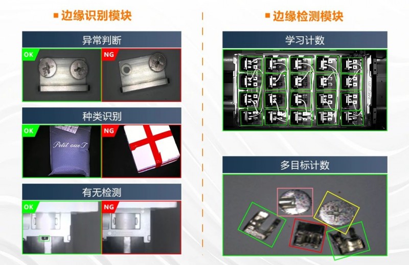 邊緣學習算法作為深度學習的一種,對樣品輕微形變、背景噪聲、環境光干擾等傳統算法難以處理的復雜工況展現出更強適應能力。邊緣學習僅需1-5張樣圖即可完成模型迭代,小樣本學習優勢與智能相機的便捷特性形成深度協同,助力項目快速落地與批量復制。