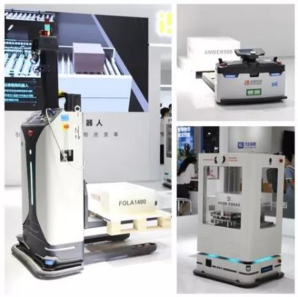 迦智科技智能無人叉車FOLA-1400-CDD(左),輕量級激光SLAM地面式自動叉車AMBER 500(右上),高精度側叉物料取放機器人(右下)