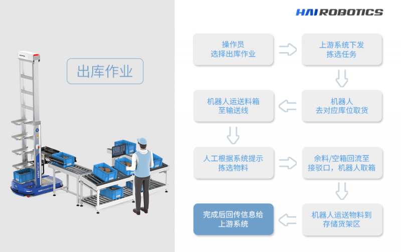 出庫:采用輸送線工作站的方式,提高出庫揀選友好性,提高響應速度。