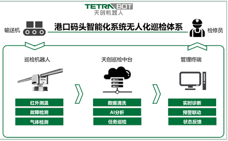 港口碼頭智能化系統無人化巡檢體系是以天創智能巡檢機器人本體為核心,基于多傳感器融合技術、機器人運動控制技術、嵌入式綜合處理技術、導航及行為規劃技術、機器人AI視覺、多量信息存儲及無線傳輸于一體軟硬件相融合打造的端云一體化智慧巡檢解決方案。