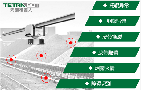 通過機器人搭載采集高清視頻圖像,利用巡檢AI算法,有效判斷皮帶跑偏,表面撕裂,路面灑落礦渣等設備故障或生產事故,并將告警信息及時反饋至控制中心,由工作人員及時進行處理。