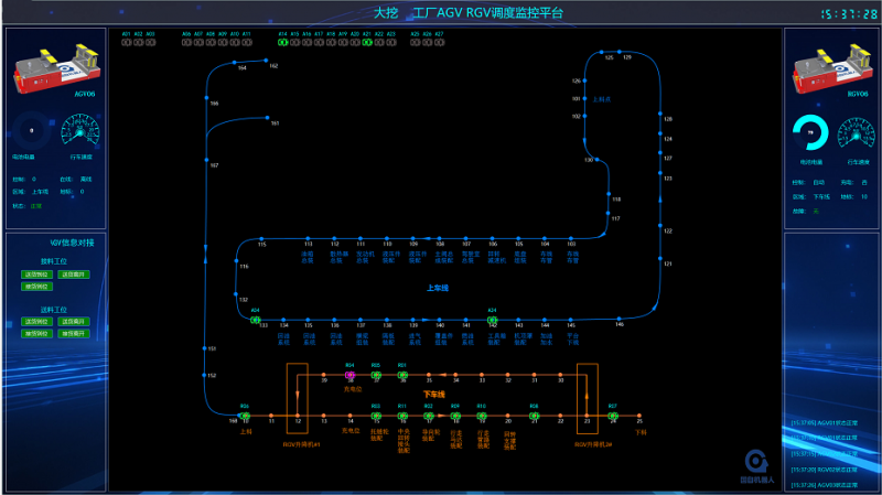 所有AGV、RGV的運行狀態(tài),均由總控系統(tǒng)發(fā)任務后,后臺有序分工、自動協(xié)同,整個車間的裝配工位、上下線工位,返回位置實時展示在電子看板上,實現(xiàn)了全程任務可視化管理。