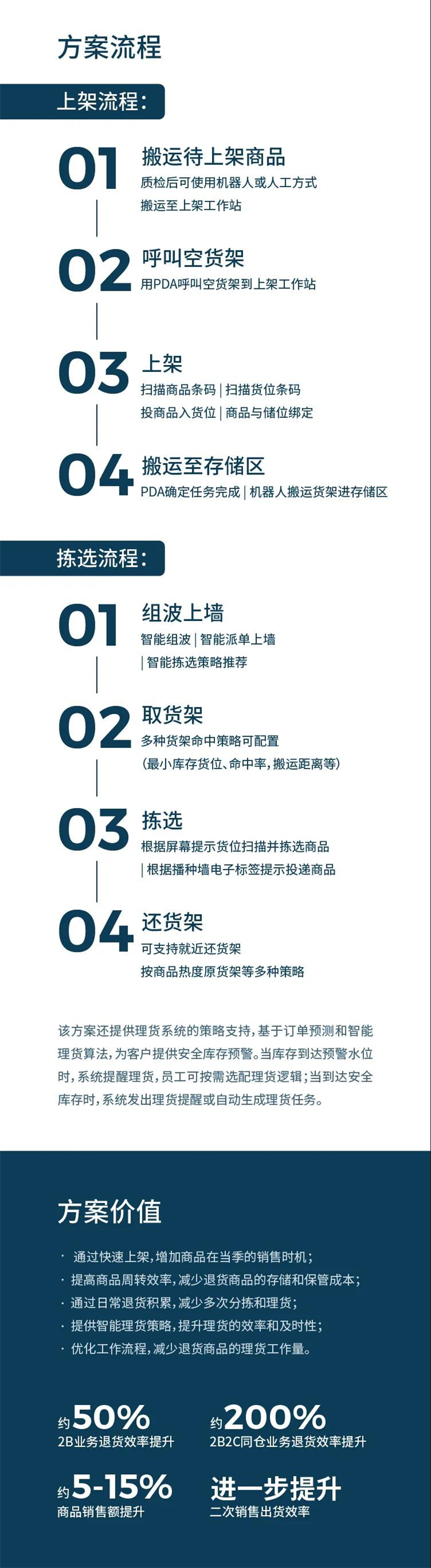 核心提示:方案價值:2B業(yè)務(wù)退貨效率提升約50%,2B2C同業(yè)務(wù)退貨效率提升約200%,商品銷售額提升約5 -15%,二次銷售出貨效率進(jìn)一步提升。