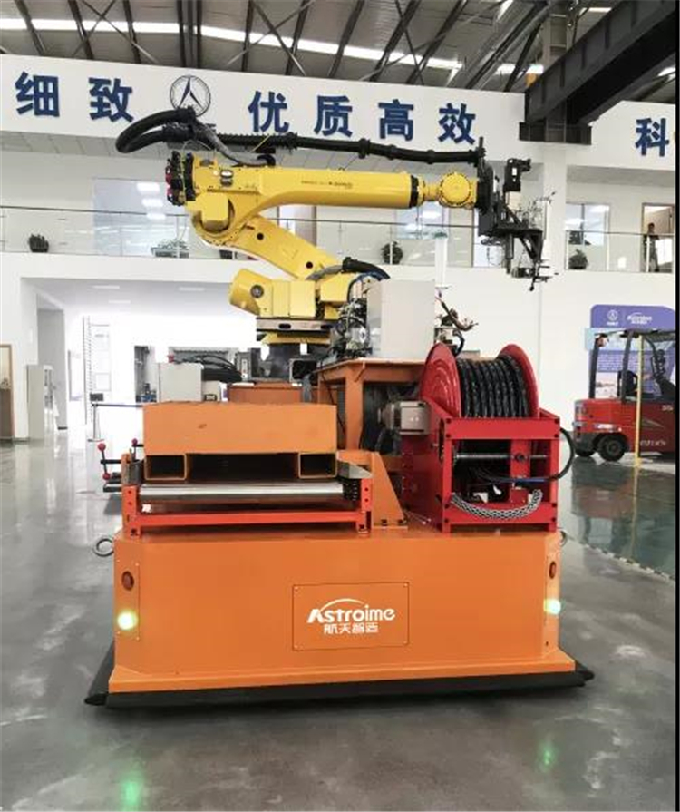 航天智造打造復(fù)合型重載AGV適用于風(fēng)電行業(yè)葉片根部雙頭螺栓的安裝與檢測,實現(xiàn)了葉片自動識別型號、自動夾取螺栓、自動進行O型橡膠密封圈安裝和涂抹螺紋膠、擰緊作業(yè)、設(shè)備扭矩數(shù)據(jù)互通等智能化。