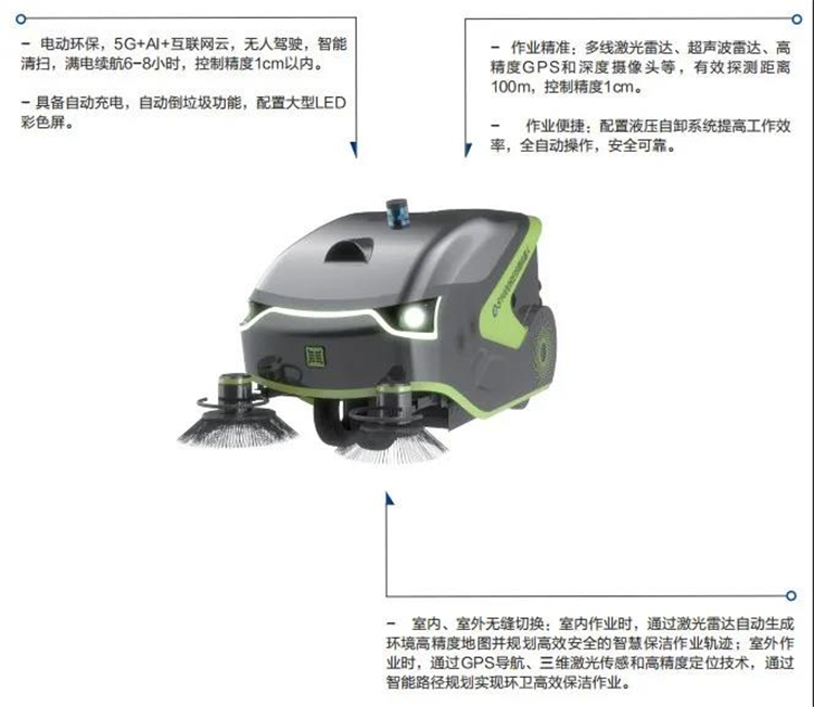 山東魯環(huán)機(jī)械設(shè)備有限公司所發(fā)布的5G無人駕駛新能源掃地車,基于5G+無人環(huán)衛(wèi)AI大腦,無人駕駛智能清掃車基于自動(dòng)駕駛控制器,能實(shí)現(xiàn)智能化和無人化作業(yè)。當(dāng)